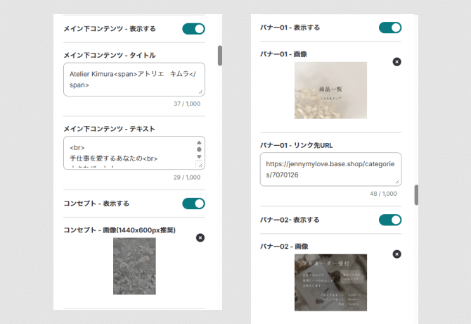また、公開後もご自身で更新しやすいよう、BASE管理画面からトップ画像やテキストを編集できるように調整しました。